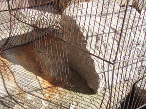 玄関先にあるサビサビでひんまがったトリカゴん中には石・・・