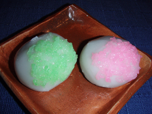 鮮やかに色染めした米粒をつけ蒸した蒸し菓子。