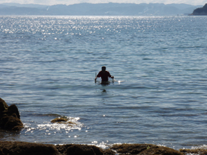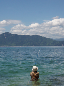 ザブンと海に浸かりながら釣り糸をたれ、