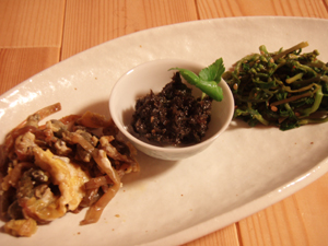 左からつくしの卵とじ、ふきのとうみそ、菜の花のきんぴら。