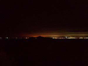 花火の煙が空にかかり、町の明かりを照らしていました。