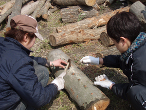 1個づつ穴をあけ、駒菌を1個ずつ植えつけていきます。