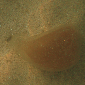 砂から中が茶色で皮?が透明な軟体の物体。