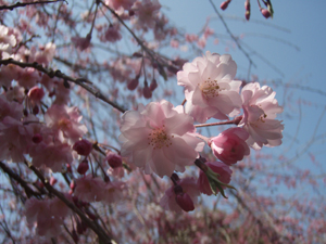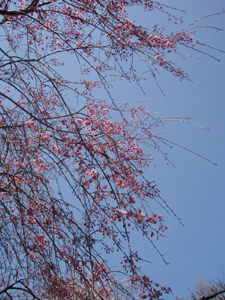 少し濃い桃色で八重咲きのしだれ桜。