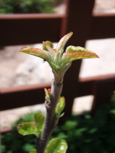まだ枝もないリンゴの木からちっこい葉っぱが出てきました♪