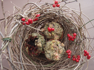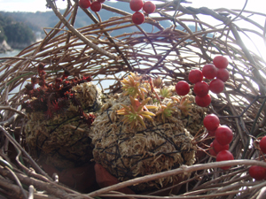 ツルをぐるぐると巻いてカゴみたいなモンを