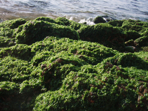 浜へおりてみると海藻のグリーンボールが